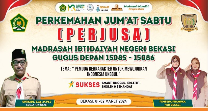 Madrasah Ibtidaiyah Negeri (MIN) Bekasi mengadakan kegiatan Perkemahan Jumat Sabtu (PerJuSa) pada tanggal 1-2 Maret 2024. Kegiatan ini berlangsung di Gugus Depan 15085-15086 dengan tema “Pemuda Berkarakter untuk Mewujudkan Indonesia Unggul.” Acara ini dihadiri oleh Kepala Madrasah, Suryadi, S.Ag, M.Pd.I, pembina pramuka, guru, dan  siswa-siswi kelas 4 dan 5 MIN Bekasi.